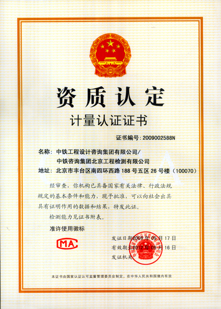 檢測公司是中關(guān)村高新技術(shù)企業(yè),具有國家認(rèn)證認(rèn)可委員會頒發(fā)的國家資質(zhì)認(rèn)定計量認(rèn)證證書,北京市建委頒發(fā)的“建設(shè)工程質(zhì)量檢測機(jī)構(gòu)”資質(zhì)證書,是鐵道部工程質(zhì)量安全監(jiān)督總站確定的“第一批鐵路建設(shè)工程質(zhì)量監(jiān)督檢測機(jī)構(gòu)”。