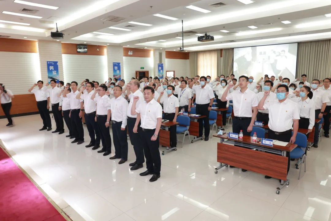 會(huì)議在莊嚴(yán)的國(guó)歌聲中開幕,安國(guó)勇總經(jīng)理帶領(lǐng)新入黨黨員代表和與會(huì)人員一同重溫了入黨誓詞。