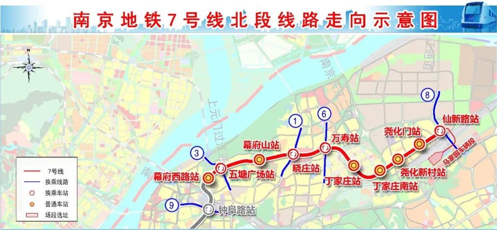 南京地鐵7號(hào)線北段工程西起幕府西路站,沿幕府西路、幕府東路行進(jìn),沿線設(shè)置五塘廣場(chǎng)站、幕府山站、曉莊站和萬(wàn)壽站,隨后向南轉(zhuǎn)入寅春路設(shè)丁家莊站,再向東轉(zhuǎn)入尖山南路設(shè)丁家莊南站,隨后沿堯佳路設(shè)堯化新村站、堯化門站,東至仙新路站。線路全長(zhǎng)13.836千米,設(shè)車站10座,均為地下車站,設(shè)區(qū)間9個(gè),設(shè)出入段線1個(gè),設(shè)車輛段1座。