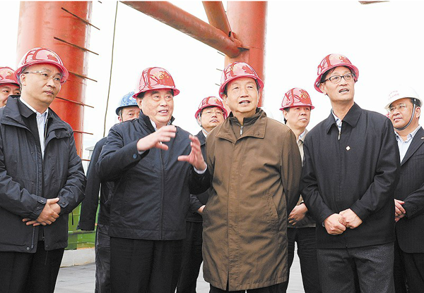 圖為馬凱在渝黔鐵路擴(kuò)能改造控制性工程白沙沱長(zhǎng)江大橋施工現(xiàn)場(chǎng)了解建設(shè)情況。(李范軒/攝)