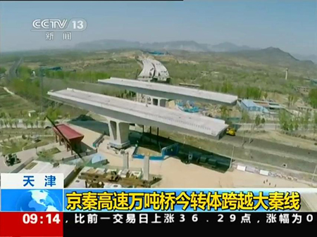 4月16日上午10時,集團(tuán)公司橋梁院設(shè)計的京秦高速公路跨大秦鐵路分離式立交橋成功轉(zhuǎn)體就位。該橋采用雙幅同步轉(zhuǎn)體62度跨越大秦鐵路,單幅轉(zhuǎn)體重量9600噸,單幅轉(zhuǎn)體長度60+60米。中央電視臺、天津電視臺等多家主流媒體對轉(zhuǎn)體現(xiàn)場進(jìn)行了報道。