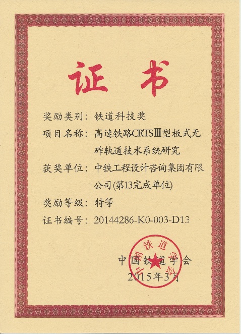 據(jù)《中國鐵道學(xué)會關(guān)于公布2014年度中國鐵道學(xué)會科學(xué)技術(shù)獎獲獎項目的通知》(學(xué)秘(2015)5號)文獲悉,中鐵工程設(shè)計咨詢集團(tuán)有限公司軌道院參選的《高速鐵路CRTSIII型板式無砟軌道技術(shù)系統(tǒng)研究》項目獲中國鐵道科學(xué)技術(shù)獎特等獎、航遙院參選的《京滬高速鐵路線路綜合維修技術(shù)研究》項目獲中國鐵道科學(xué)技術(shù)獎一等獎、橋梁院參選的《鐵路橋梁球型支座》項目獲中國鐵道科學(xué)技術(shù)獎二等、軌道院參選的《高速道岔和鋼軌伸縮調(diào)節(jié)器應(yīng)急處置技術(shù)及裝備研究》項目獲中國鐵道科學(xué)技術(shù)獎三等獎。